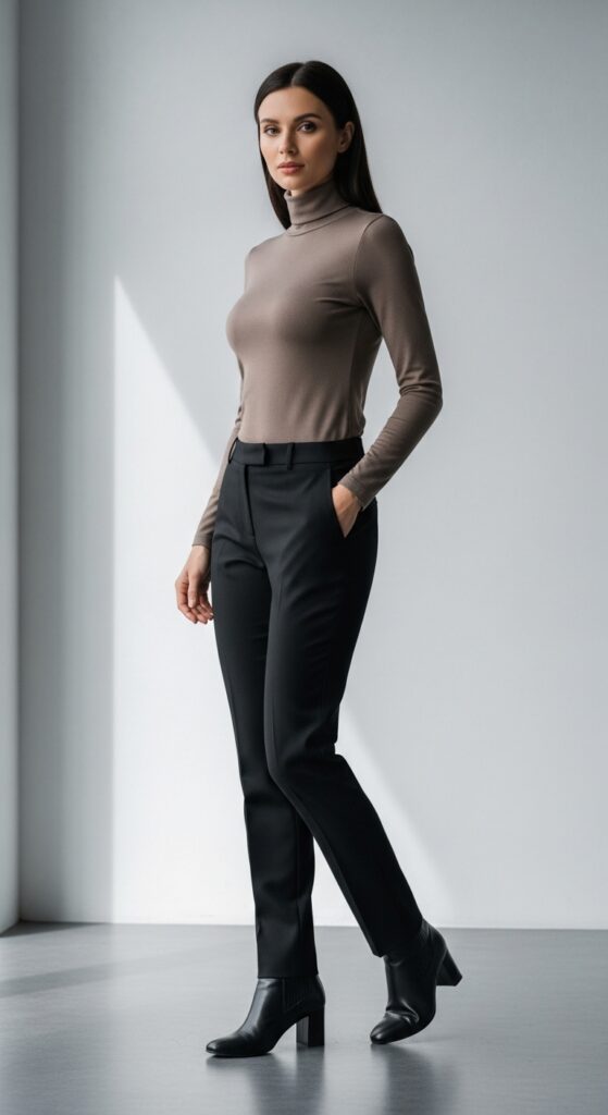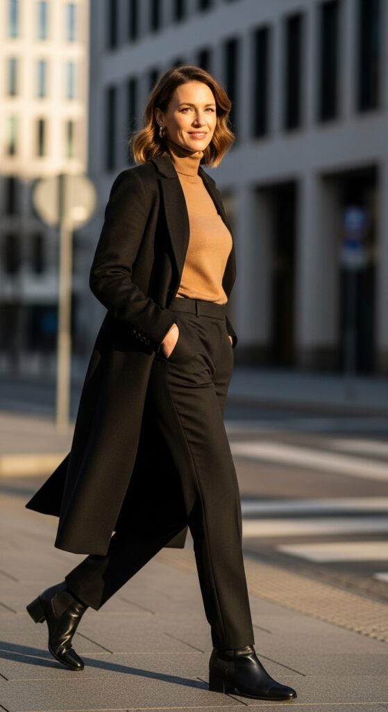 Keep what’s underneath simple. A basic turtleneck or fitted top tucked into your formal trousers works perfectly because the coat is the statement piece here. I’m obsessed with camel coats and long wool trenches for this look, but a black or grey coat works just as beautifully.