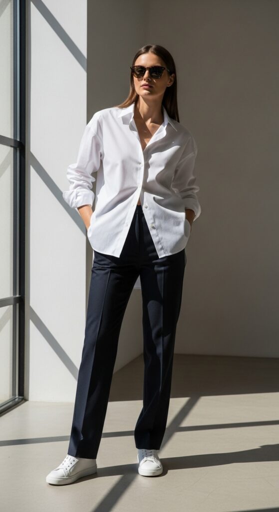 Look, I know this sounds basic, but hear me out. There’s a reason this combo has survived decades of fashion trends. Pairing crisp formal trousers with a white button-down shirt is like the little black dress of work outfits. It just works. Every single time.