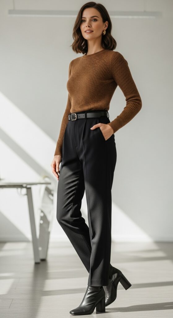 Go for a crew neck or V-neck sweater in a quality knit (cashmere if you’re fancy, merino wool if you’re practical). Tuck it into high-waisted formal trousers and add a belt to define your waist. The combination of the soft sweater and structured trousers creates this beautiful contrast that just works.