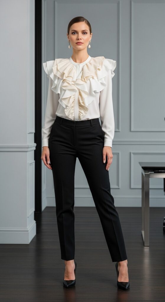 Sometimes you just need a little drama in your life, and a statement blouse with formal trousers delivers exactly that. I’m talking ruffles, bold prints, interesting sleeves, or unique necklines. Basically anything that makes people say “oh, I love your top” in the elevator.