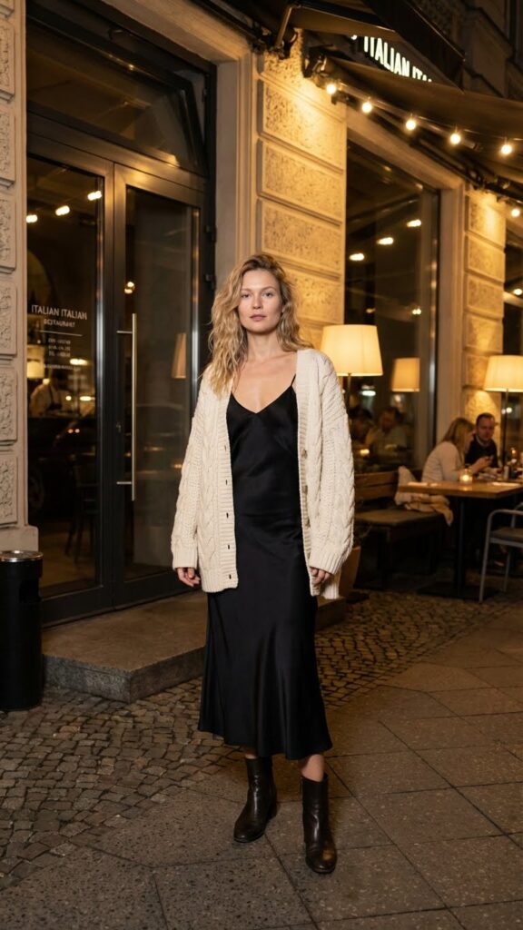 This combo is the fashion equivalent of a warm hug meets main character energy. A silky slip dress on its own can feel a little too fancy for a casual Friday dinner, but throw an oversized knit cardigan over it? Instant balance.