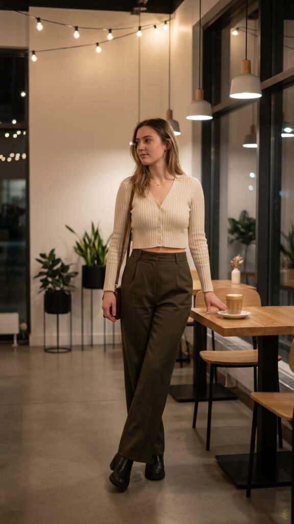 A fitted cropped cardigan with interesting buttons or a fun print works beautifully on its own. Pair it with high waisted wide leg pants or a mini skirt depending on your comfort level. This look reads cozy and intentional at the same time.