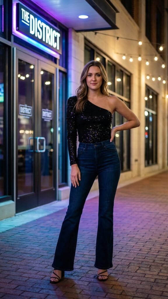 We’re talking dark wash, high waisted, and perfectly fitted. Then comes the fun part: the top. This is where you bring the drama. A sequined cami, a one shoulder number, a bodysuit with interesting cutouts. Whatever makes you feel like that version of yourself who has their life together.