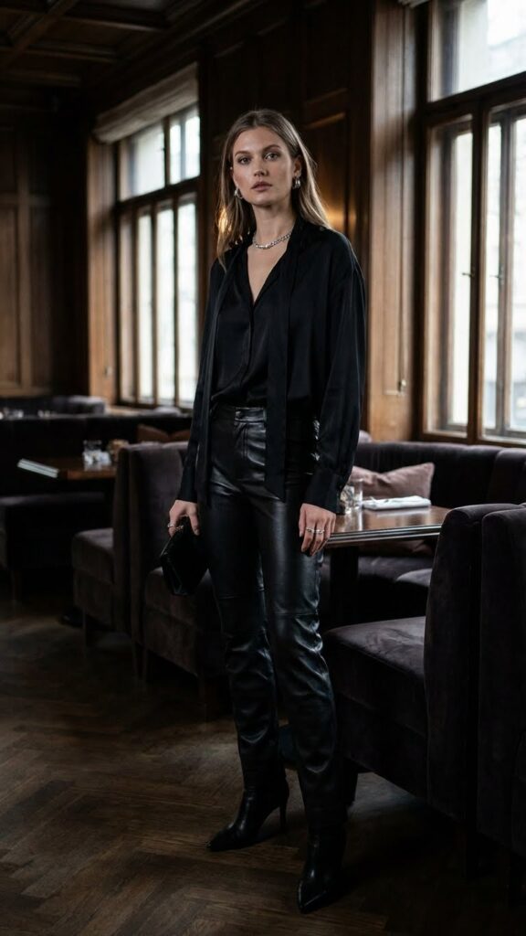 A flowy, romantic blouse tucked into high waisted leather trousers creates this gorgeous tension between tough and soft. Think puff sleeves, a subtle ruffle, or even a simple silk cami. Keep accessories minimal and let the outfit do the talking.