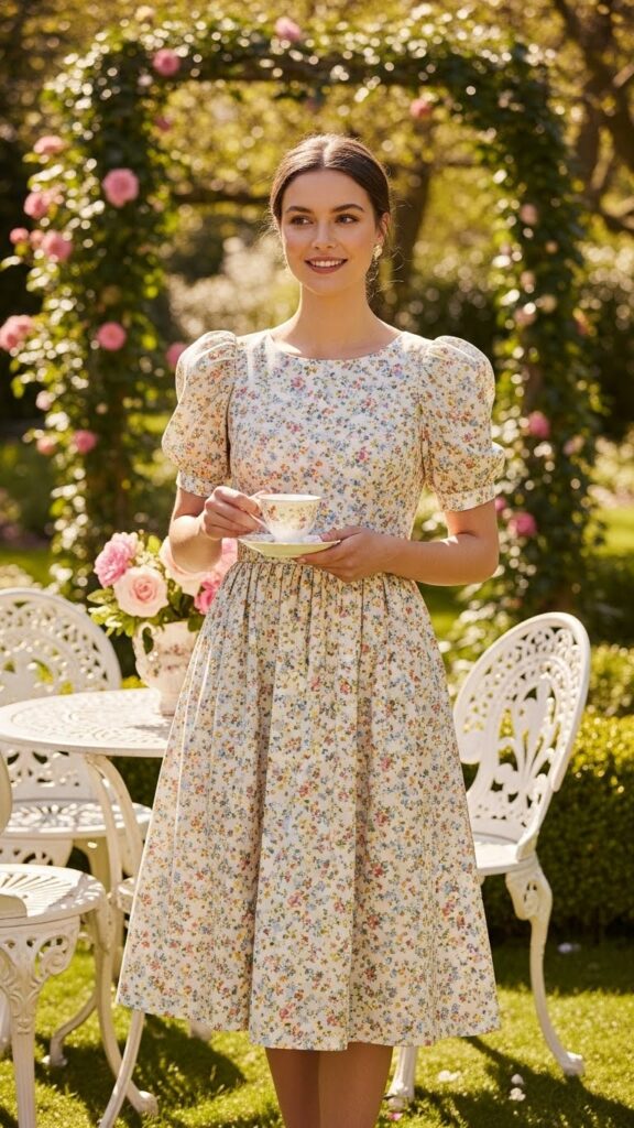 Tea dresses exist for garden parties, and I will stand by that forever. A knee-length dress with a ditsy floral print, a defined waist, and a slightly flared skirt captures that vintage romantic aesthetic perfectly. Look for details like peter pan collars, covered buttons, or gentle puff sleeves to elevate it further.