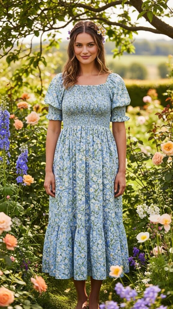 If you haven’t embraced the cottagecore trend yet, garden parties are your excuse. A smocked bodice dress with a tiered skirt in gingham, eyelet, or a soft floral print is basically the uniform for romantic outdoor events. And that stretchy smocking? Absolute perfection for eating tiny sandwiches and not feeling like you need to unbutton something afterwards.