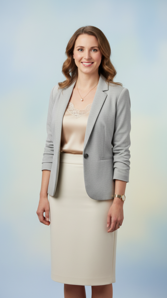 Choose a knee-length pencil skirt in navy, black, or charcoal for a timeless foundation. Layer a silk camisole underneath for luxurious texture and comfort. Complete the look with a customized blazer that cinches at your waist.