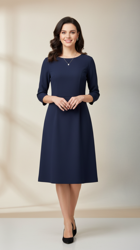 Choose a knee-length shift dress in solid colors like navy, burgundy, or emerald green. The classic A-line silhouette flatters most body types while maintaining appropriate formality. Select your preferred neckline style—crew neck offers timeless elegance, while boat necks create sophisticated lines.