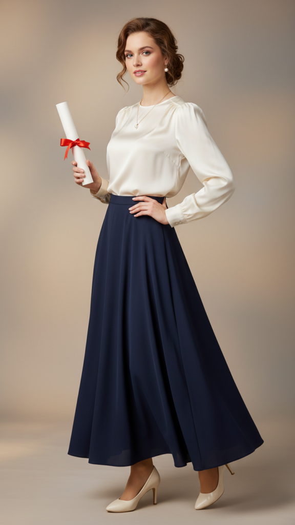 The classic A-line skirt paired with a silk blouse creates an effortlessly polished graduation look that strikes the perfect balance between professional and celebratory. You’ll love how this combination flatters every body type while maintaining sophistication throughout your special day.