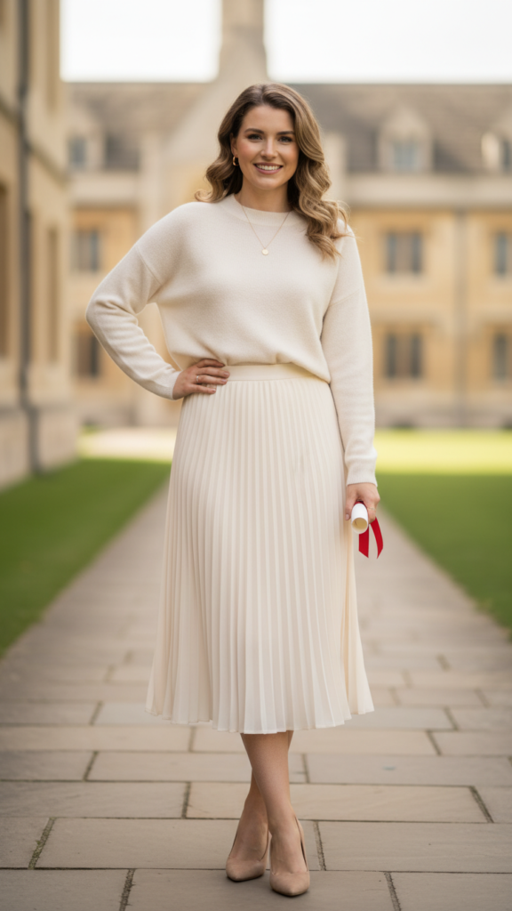 Choose a pleated A-line skirt in navy, charcoal, or cream, then add a structured belt to define your waistline. Your cashmere sweater pairing should feature a classic crew neck or subtle V-neck in complementary tones. This elegant convocation ensemble strikes the perfect balance between formal and comfortable for your ceremony. Complete this polished ensemble with pointed-toe flats or low block heels. This combination offers comfort during long ceremonies while maintaining the refined appearance your achievement deserves.