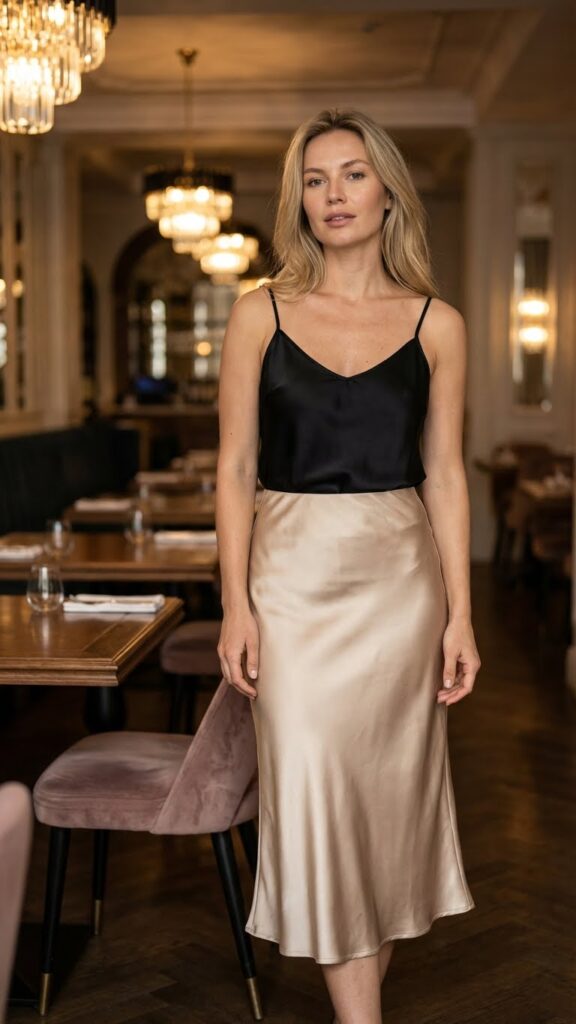 The trick here is keeping the top simple so the skirt stays the star. A black cami or a tucked-in white tee works beautifully. Add some strappy heels if your venue allows, or go with pointed-toe mules if you’re keeping things practical. I once tried this with chunky sneakers thinking I was being fashion-forward. Spoiler: I was not. Stick with something refined and thank me later.