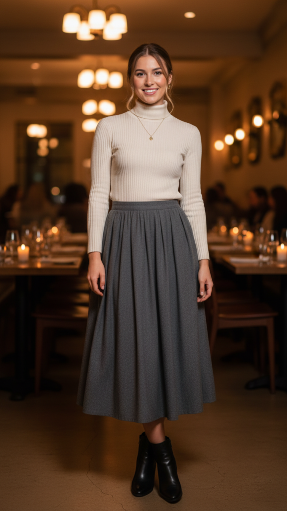 Perfect for creating a sophisticated yet approachable look, this combination delivers modern elegance with comfortable practicality. You’ll achieve effortless style by pairing a fitted turtleneck with a midi pleated skirt in complementary colors like navy and cream or black and burgundy.