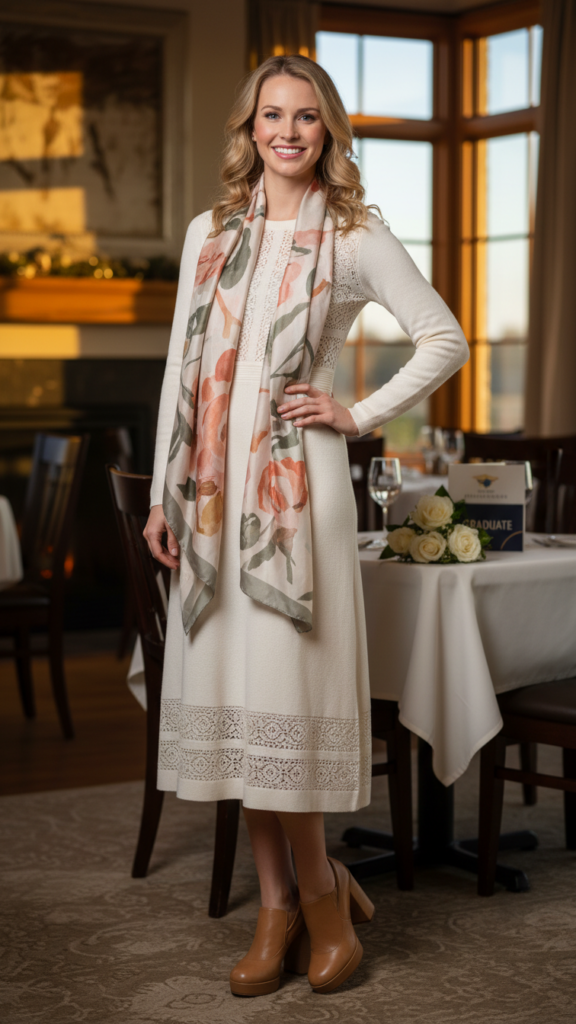 Choose ankle boots with a modest heel for comfort during long ceremonies and dinner events. Cozy layers work beautifully here—add a structured blazer or cardigan for temperature control. Keep minimalist accessories simple: delicate jewelry, a small crossbody bag, and a classic watch complete the ensemble perfectly for your special celebration.