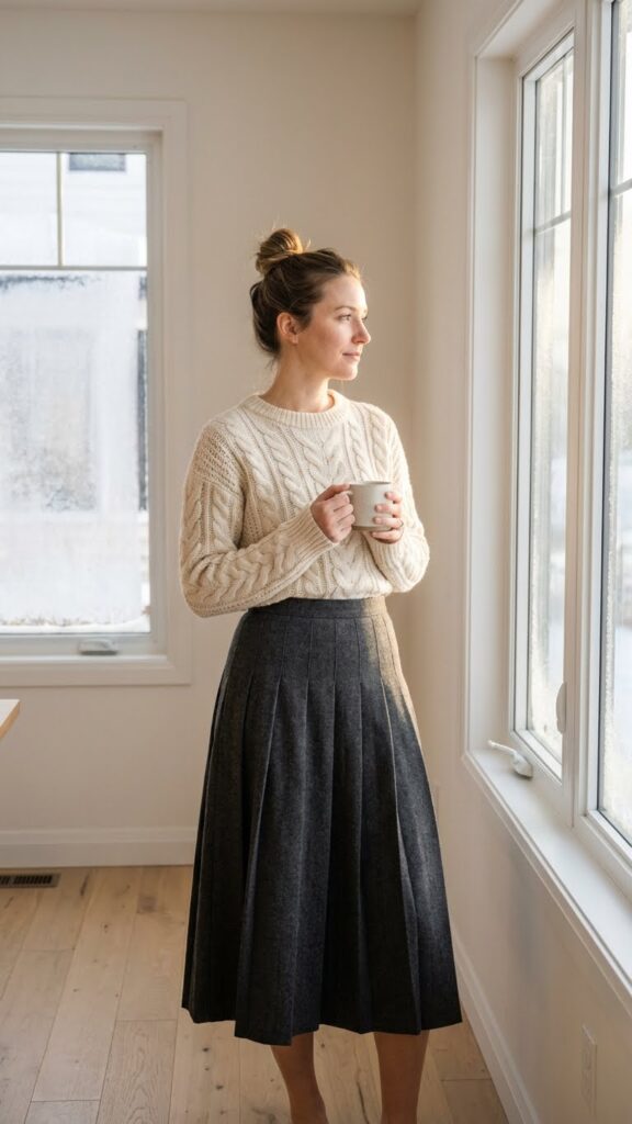 When temperatures drop, pairing a chunky knit sweater with a pleated midi skirt creates a perfectly balanced winter outfit. This combination lets you move freely while staying warm and looking polished.