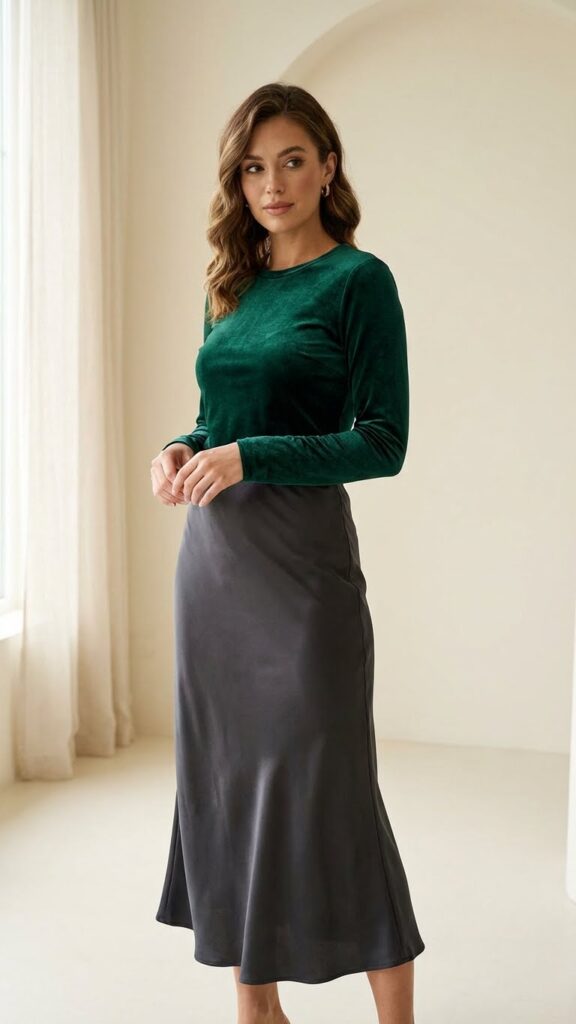 Choose a jewel-toned velvet top in burgundy, emerald, or navy to complement your grey satin slip skirt. This combination works perfectly for holiday parties and evening events. You’ll love how the materials play off each other, creating visual interest without overwhelming your look.
