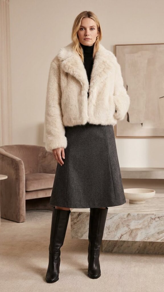 Layering a faux fur coat over a customized grey A-line skirt immediately enhances your winter wardrobe to statement-making status. The faux fur texture adds luxurious depth while the structured silhouette of the skirt keeps everything polished and intentional.