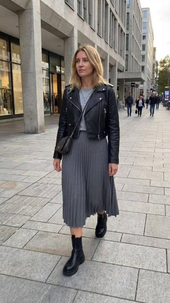 A leather jacket instantly alters your grey skirt from soft and feminine to bold and edgy. This combination creates a biker chic aesthetic that commands attention without trying too hard. You’ll love how the structured leather contrasts against flowing grey fabric.