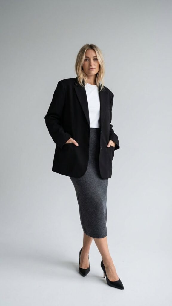 Oversized blazers create a sophisticated silhouette that alters any grey pencil skirt into a polished power outfit. The structured blazer silhouette adds dimension while keeping your look relaxed and modern. You’ll love how this pairing moves effortlessly from meetings to after-work drinks. Chic cold-weather styling can be achieved with a black skirt as well.