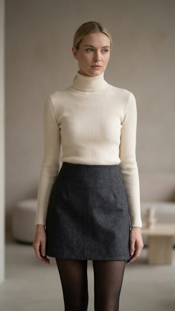 Turtlenecks tucked into high-waisted grey mini skirts create one of winter’s most flattering and cozy combinations. This pairing elongates your silhouette while keeping you warm during colder months. You’ll love how the fitted turtleneck balances the shorter hemline for a polished look.