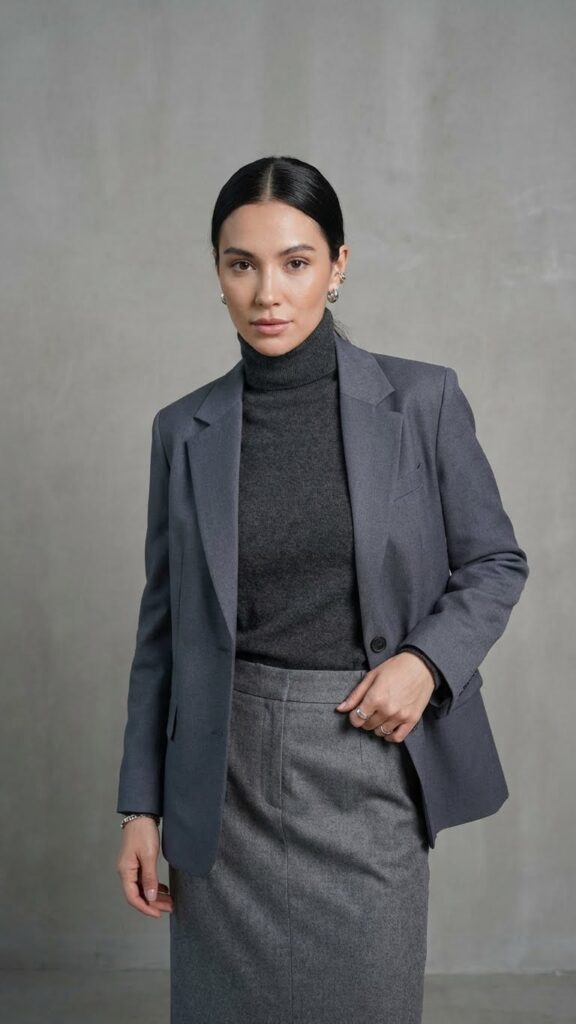 For an enhanced workwear look, stick to neutral blazer tones like black, camel, or charcoal. These colors complement grey beautifully and give you endless mixing options. Add pointed-toe heels to elongate your legs and complete the professional vibe. You’re creating a wardrobe that works as hard as you do.