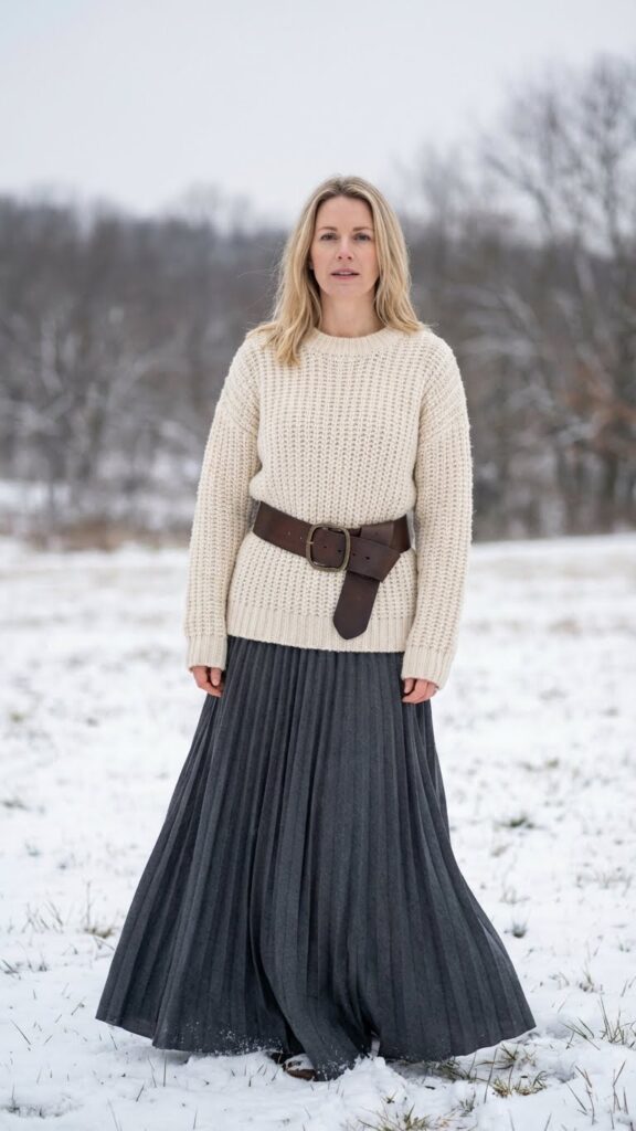 You’ll want to contrast your sweater’s thick, cozy knit against the skirt’s flowing pleats. This textural play adds dimension without overwhelming your frame. Try an oversized cream sweater tucked loosely into a charcoal pleated skirt. Grey skirt winter outfit ideas for soft, neutral styling can elevate this look.