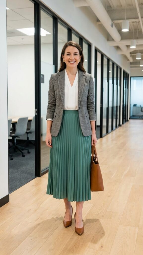 Choose lightweight fabrics for your pleated skirt to guarantee comfortable movement throughout your workday. The blazer’s structured lines balance the skirt’s flowing pleats perfectly.