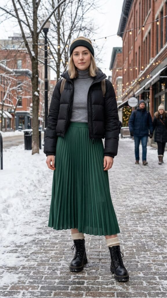 Master cozy layering techniques by adding a cropped puffer jacket in black, cream, or metallic silver. This shorter length highlights your skirt’s flowing movement while keeping your core warm. Underneath, try a fitted turtleneck or chunky knit sweater.