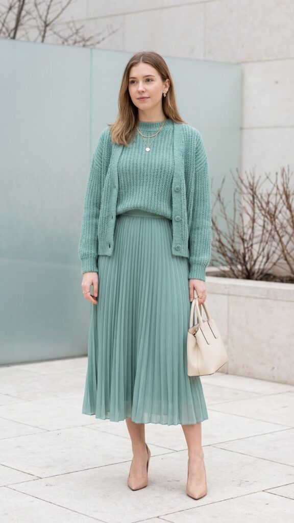 You’ll achieve a cozy monochrome effect by pairing your seafoam pleated skirt with a matching knit sweater and cardigan set. This layered approach keeps you warm while maintaining a minimalist silhouette that feels effortlessly polished.