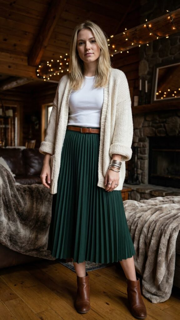 When winter weather calls for cozy layers, an emerald pleated skirt paired with a chunky cream cable knit sweater creates a stunning balance of sophistication and warmth.