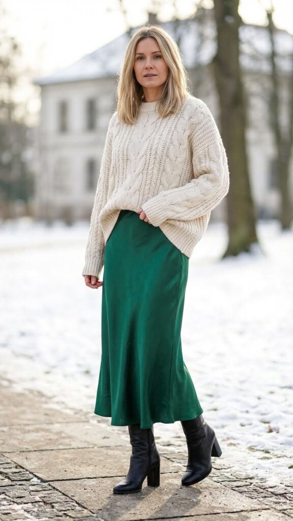 A chunky cable knit sweater paired with heeled boots creates the perfect balance of cozy and sophisticated when styling your green satin skirt for winter.