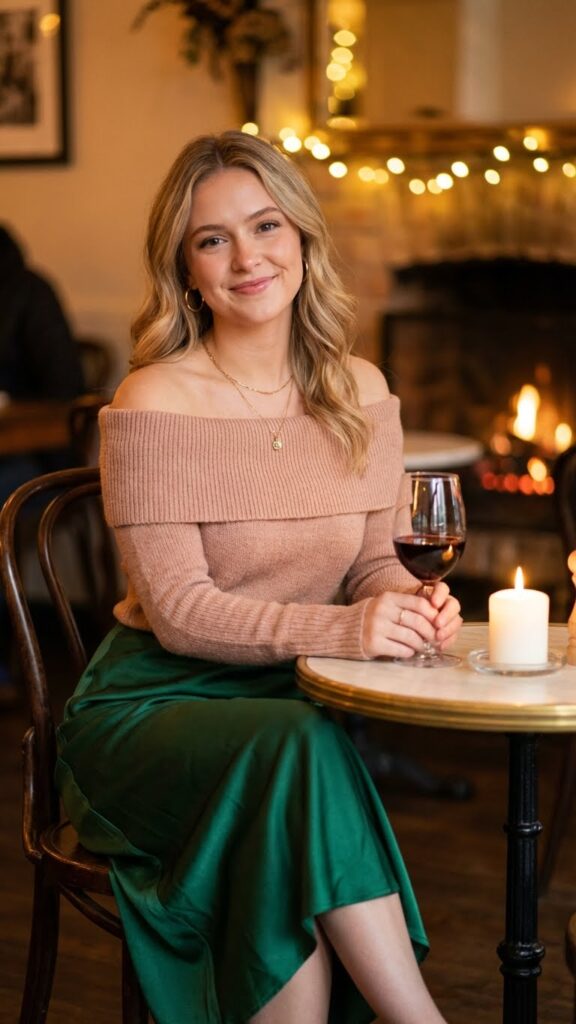 This combination delivers instant romantic date night appeal without sacrificing comfort. Choose a fitted sweater in cream, black, or blush pink to complement the green satin beautifully. The contrast between the soft knit texture and lustrous fabric adds visual interest to your ensemble.