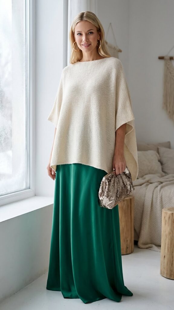 A cozy knit cape offers another stunning option for styling your green satin skirt during winter months. This dramatic layering piece creates beautiful movement while keeping you warm and comfortable throughout the season.