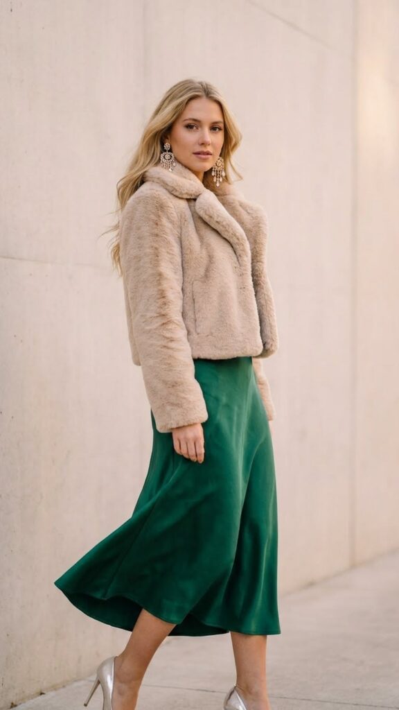 When you’re ready to raise your green satin skirt to glamorous heights, nothing delivers quite like a cropped faux fur jacket paired with bold statement earrings. This combination lets you express your unique style while staying warm during chilly winter nights.