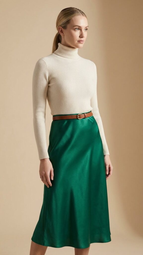Tucking a fitted turtleneck into your green satin skirt creates a sleek, polished silhouette that’s perfect for winter styling. This combination lets you move freely while looking effortlessly put together for any occasion.