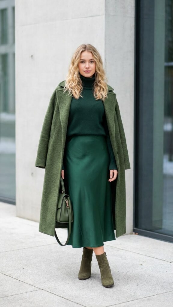 Start with a fitted hunter green turtleneck featuring textured knit details for visual interest. Add a long wool coat in a slightly darker or lighter green shade to create depth without breaking the color flow.