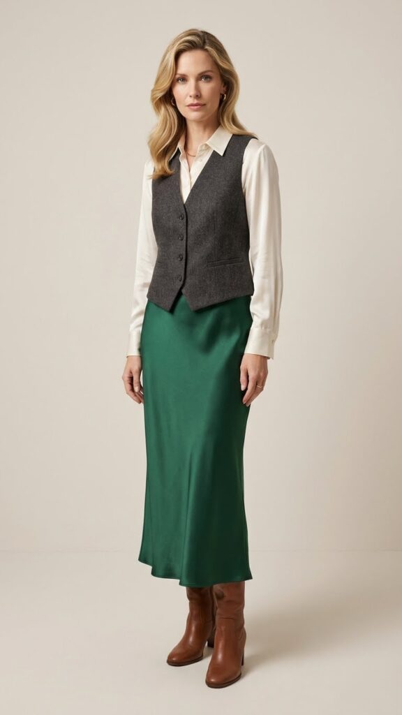 Select a cream or ivory silk blouse to create contrast against the green satin. The vest adds warmth without bulk, giving you freedom to move comfortably throughout your day. Opt for neutral vest colors like charcoal, black, or camel to keep the focus on your striking skirt.