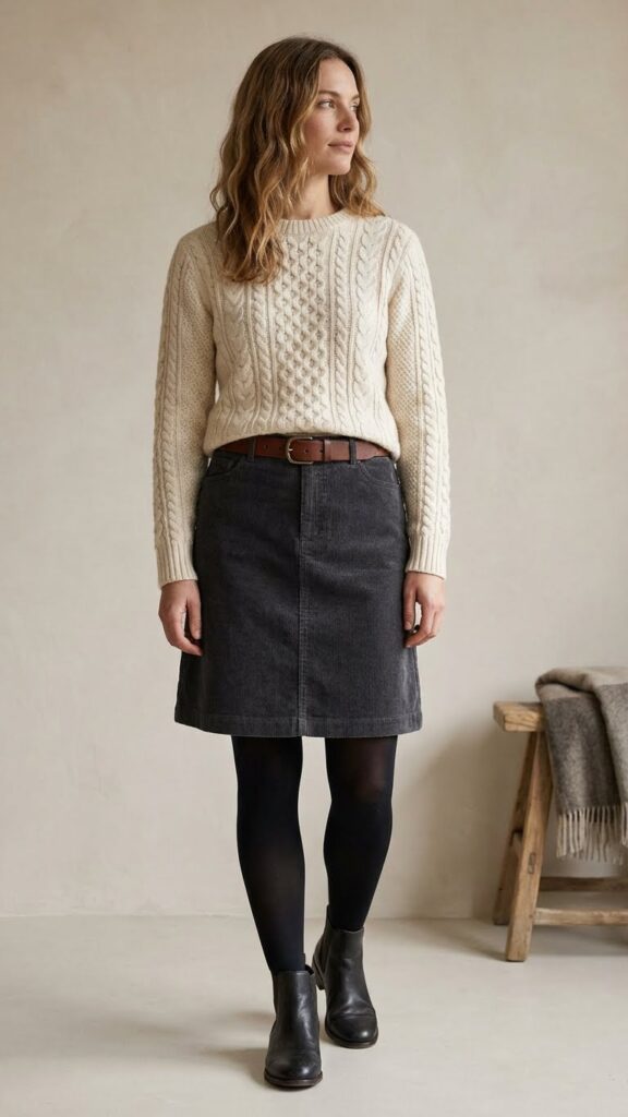 Texture takes center stage when you pair a grey corduroy skirt with a cozy cable knit pullover. This combination creates visual interest through contrasting weaves while keeping you warm during chilly months. The ribbed texture of corduroy complements the dimensional patterns found in cable knit sweaters beautifully.