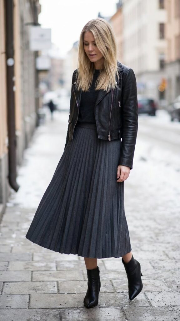 When you want to add edge to your winter wardrobe, a pleated grey midi skirt paired with a leather jacket creates an effortlessly cool combination. The movement of pleats brings feminine flow, while the structured jacket adds rebellious attitude. Stylish winter outfits with pleated skirts can add a touch of elegance to your look.