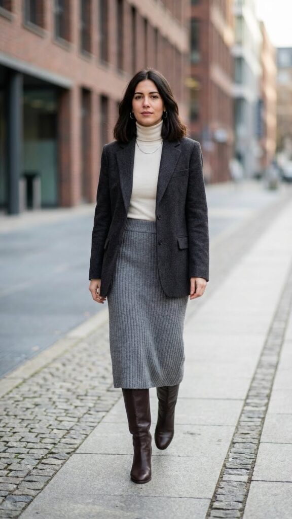 Choose knee-high or over-the-knee boots in black or brown leather to elongate your silhouette. A fitted blazer in navy, camel, or charcoal adds polish without restricting your movement throughout the day. Gray skirts are a versatile option for winter layering that can be dressed up or down.