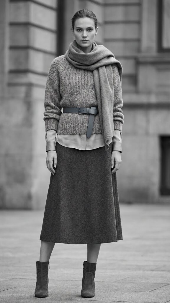 Start with a charcoal wool skirt as your foundation. Add a light grey silk blouse underneath a heather grey chunky knit sweater. These layered textures prevent your outfit from appearing flat or one-dimensional.