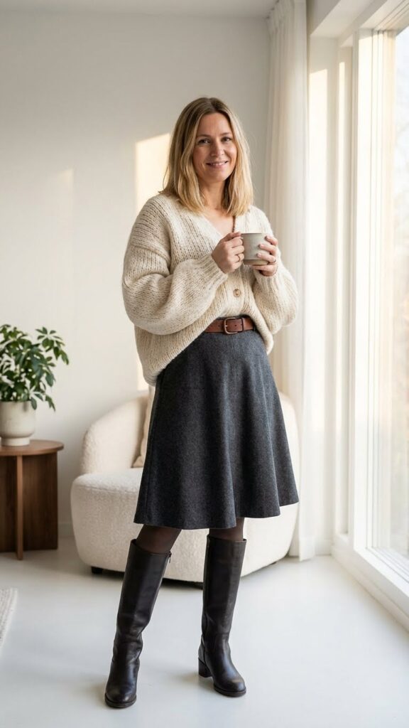 Select an oversized cardigan in cream, camel, or charcoal for visual interest. Tuck the front hem slightly into your skirt’s waistband. Complete this outfit with knee-high boots and simple gold jewelry for a refined finish.