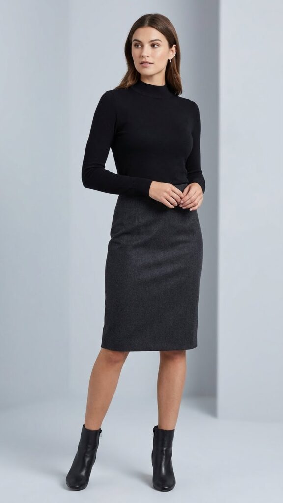 Sleek sophistication defines this pairing of a grey wool skirt with a fitted mock neck top. You’ll love how this combination creates a streamlined silhouette that moves effortlessly from office to evening events.