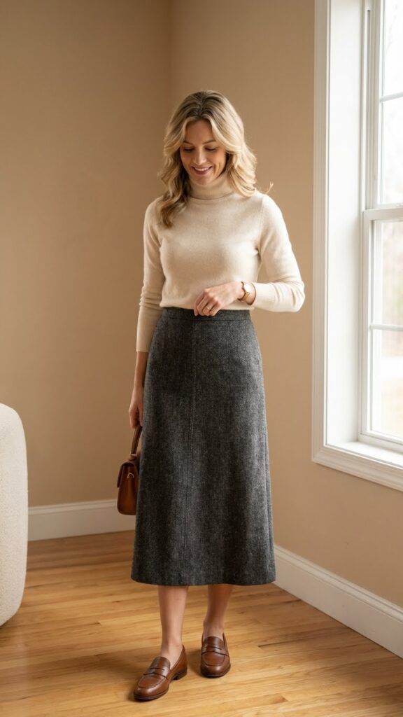 When you’re aiming for timeless elegance, the grey tweed skirt paired with a cashmere sweater and loafers delivers effortlessly. This combination creates layered textures that add visual interest without overwhelming your frame. The tweed’s woven pattern plays beautifully against smooth cashmere, giving you depth and sophistication.