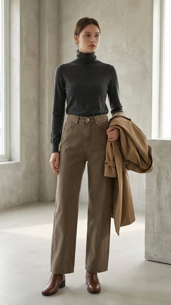 Choose from classic black, cozy cream, or rich autumn tones like burgundy or forest green. Layer a long coat over everything when it’s extra cold, or keep it simple with just the turtleneck and jeans. Add ankle boots or loafers, throw on some gold jewelry, and you’ve got an outfit that transitions seamlessly from day to night. This is the kind of look that makes you feel like you have your entire wardrobe figured out.