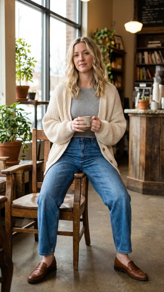 An oversized knit cardigan over a simple fitted tee and baggy jeans is the ultimate cozy outfit. The long, flowy cardigan adds drama and warmth while the fitted tee underneath keeps everything balanced and intentional.