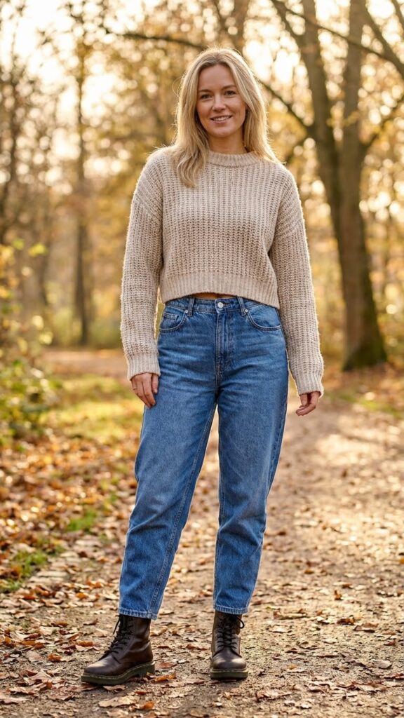 Go for chunky knits in cream, camel, or rust for those autumn vibes, or try a fitted cropped cardigan for something a little different. Layer a collared shirt underneath if you want to add dimension, or keep it simple with just the sweater. Finish with combat boots or chunky loafers, and you’ve got a look that’s equal parts cozy and cool. You’ll be reaching for this combo on repeat, trust me.