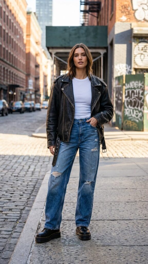 Keep the top simple—a plain white tee or a fitted black tank works perfectly here. The leather jacket becomes the statement piece, so you don’t need to overcomplicate things. Add chunky boots or sleek sneakers, maybe a crossbody bag, and you’re giving off serious cool-girl energy. This outfit works for concerts, nights out, or literally any time you want to feel like the main character.