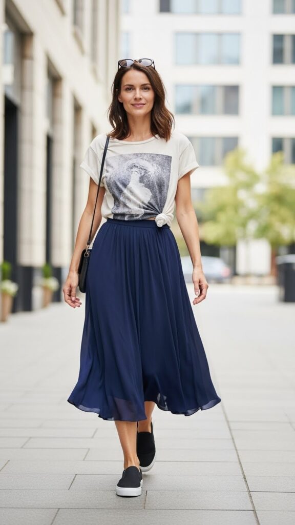 Go for a skirt in a lightweight fabric—cotton or rayon blends work great. As for the tee, keep it simple or add personality with a vintage band shirt or something with a quirky print. Slip-on sneakers or minimal mules complete the look without making it feel overdone.