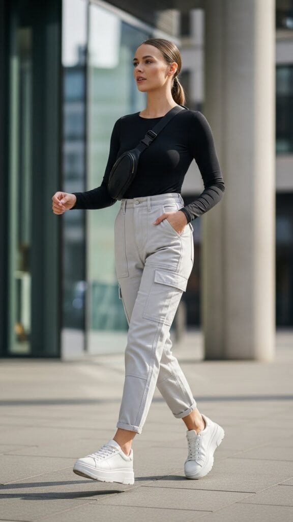 Style them with a simple cropped tank top—black, white, or a soft neutral works perfectly. The high-waisted cut of the pants creates this elongated silhouette that’s both flattering and practical. Slide into some leather sandals or platform sneakers, and you’ve nailed that “I’m stylish but also here to explore” energy.