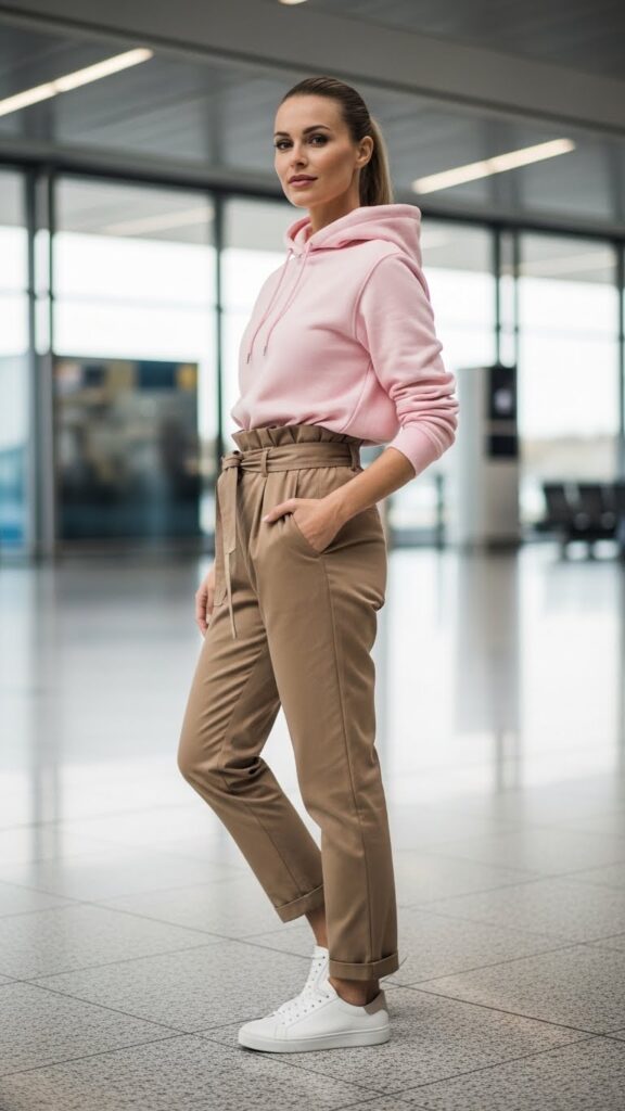 If you want to look more polished but refuse to sacrifice comfort, paper bag waist pants are your answer. These high-waisted beauties are basically fancy sweatpants, and they look amazing with a tucked-in hoodie or a cropped style. The cinched waist creates shape while the relaxed leg keeps things comfortable for long travel days. Add some loafers or sleek sneakers, and you’ve got an outfit that could honestly work for a casual work meeting if needed. Accessorize with a structured handbag and some minimal jewelry. This look proves you can be cozy and put-together at the same time. The paper bag waist adds just enough visual interest that your outfit doesn’t read as purely athletic wear.